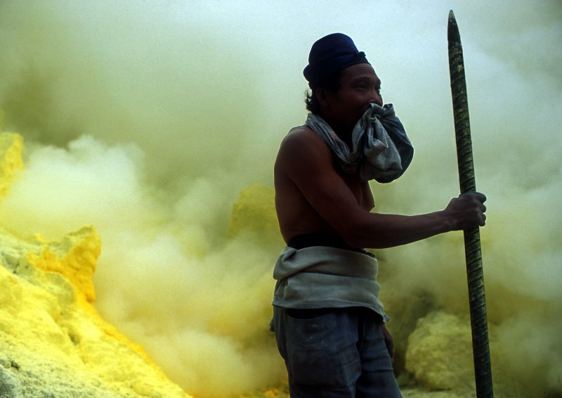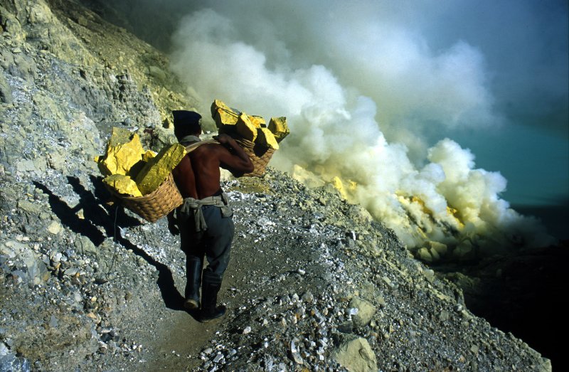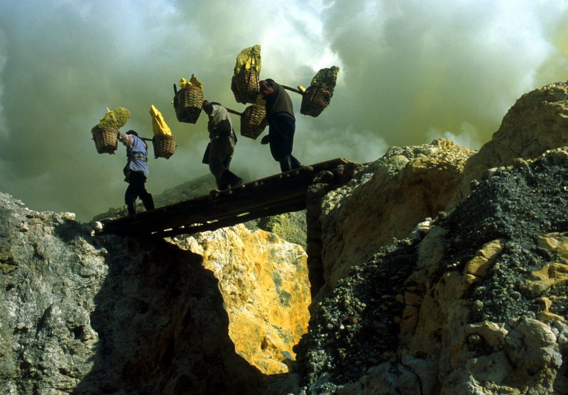 Wschodnia Jawa, Indonezja. Mija trzydzieści lat jak Pak Augus wydobywa siarkę z krateru na szczycie góry Kawah Ijen. Każdego dnia dźwiga na plecach dwa kosze, połączone jarzmem, znosząc urobek do doliny u stóp góry. Za każdym razem jego plecy muszą wytrzymać ciężar 70 - 100 kg. Dla turystów ludzie tacy, jak Pak Augus stanowią turystyczną atrakcję. Chętnie zaczepiają i fotografują robotników – duchy minionej epoki.