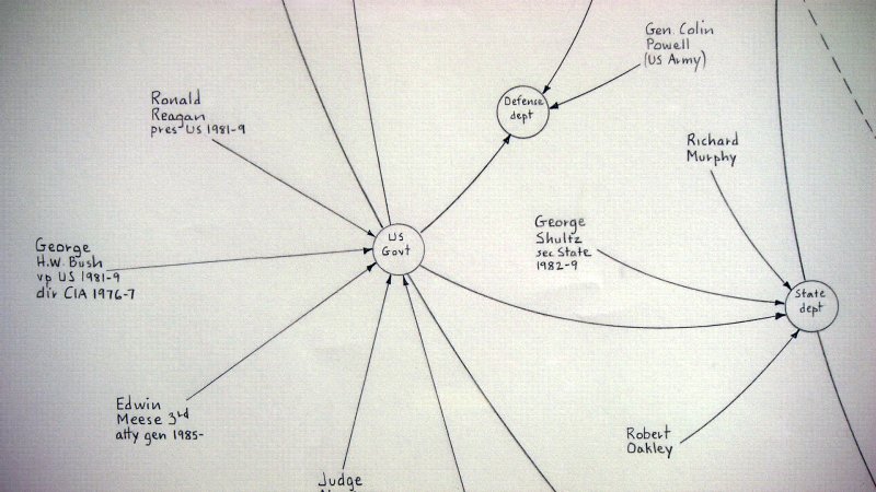 Mark Lombardi, amerykański rysownik pasjonował się analizą i dokumentacją nadużyć władzy. W pracy Lombardi wykorzystywał jedynie powszechnie dostępne źródła z zakresu polityki, bankowości czy szpiegostwa, których „zapewne nie przeczytał nikt poza Markiem”, jak twierdzi jeden z przyjaciół artysty. Lombardi pozostawił po sobie 14,5 tysiąca fiszek, na których skrupulatnie notował znalezione informacje. Następnie analizował połączenia pomiędzy najważniejszymi z nich i nanosił je na papier w postaci map myślowych. Jego prace były na tyle wnikliwe i detaliczne, że po zamachach na World Trade Center FBI wykorzystało je w celach badawczych.